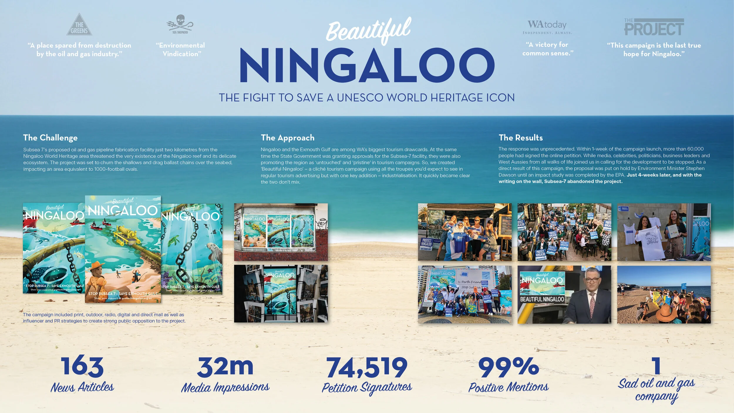 Subsea 7’s proposed pipeline fabrication facility just 2-kilometres from the Ningaloo World Heritage area prompted PROTECT NINGALOO to launch an advocacy campaign calling on the State Government to protect the region from industrialisation. ‘Beautiful Ningaloo’ was a cliché tourism campaign using all the tropes you’d see in a regular tourism campaign but with one key addition – industrialisation. The campaign forced proponent Subsea-7 to scrap their plans after an EPA assessment was ordered by the Environment Minister.